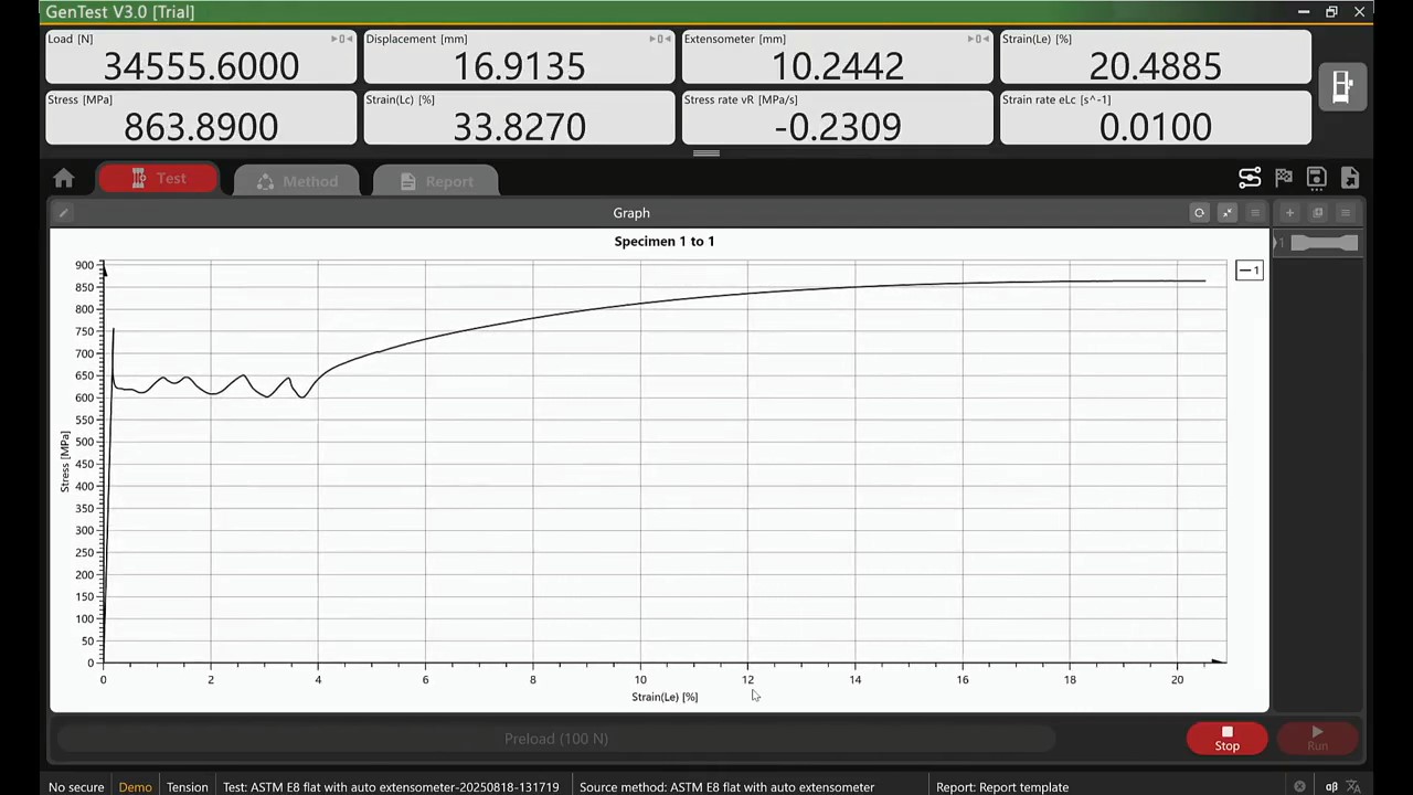 It real time display load, displacement and extension, multiple curves, like load-time, load-displacement, load-extension, stress- strain, etc. These points, like yield point, Rp, Rm, Elastic Modulus can be marked on the curve.